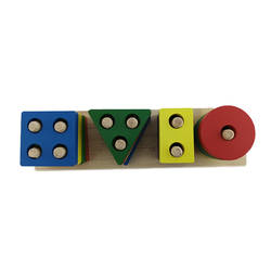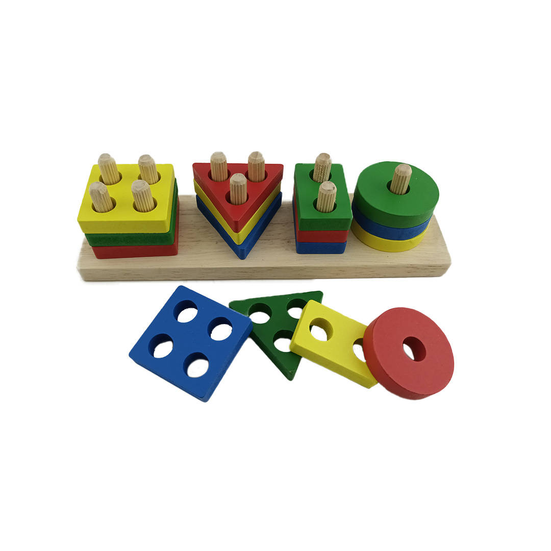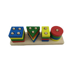 - Juguete didáctico de madera con forma de torre de 4 columnas simulando para apilar piezas de formas distintas.