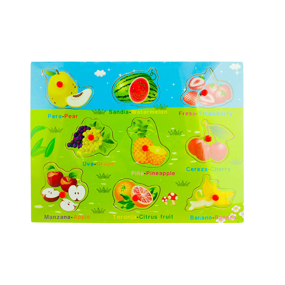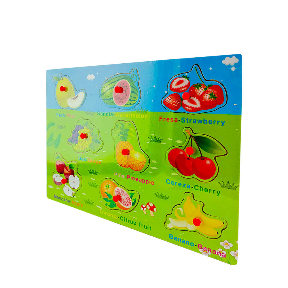 JUEGO DIDACTICO MADERA (PUZZLE CON PUSH PINS FRUTAS ESPAÑOL-INGLES) 30X22cm DURBAN