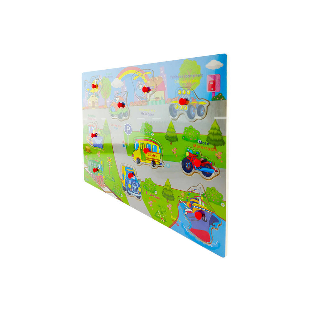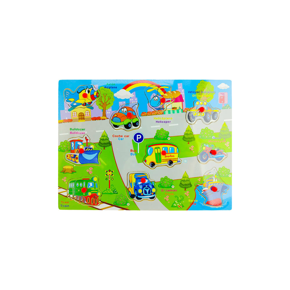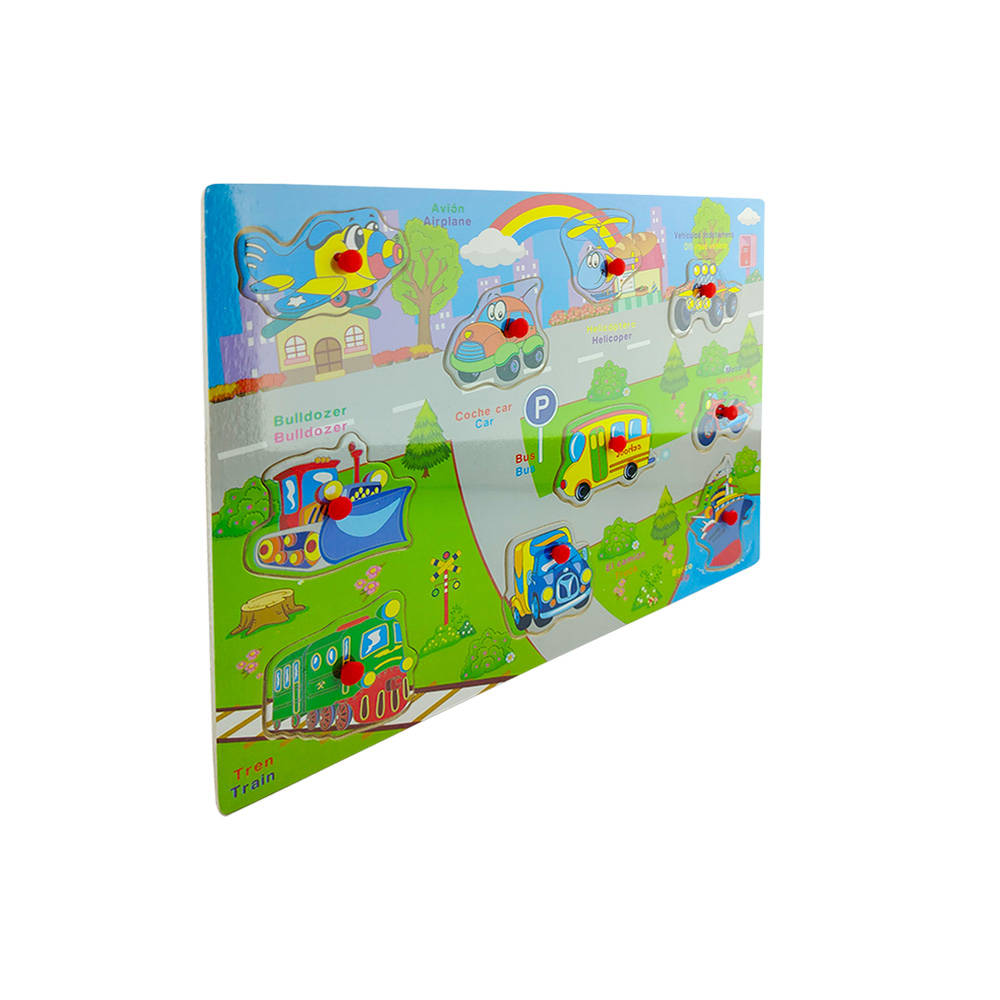 JUEGO DIDACTICO MADERA (PUZZLE CON PUSH PINS MEDIOS DE TRANSPORTE ESPAÑOL-INGLES) 30X22cm DURBAN