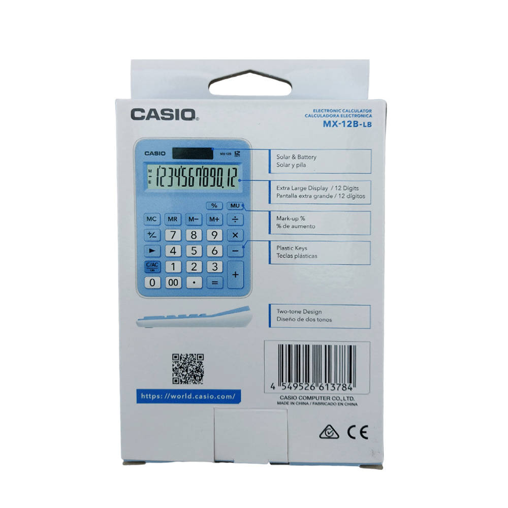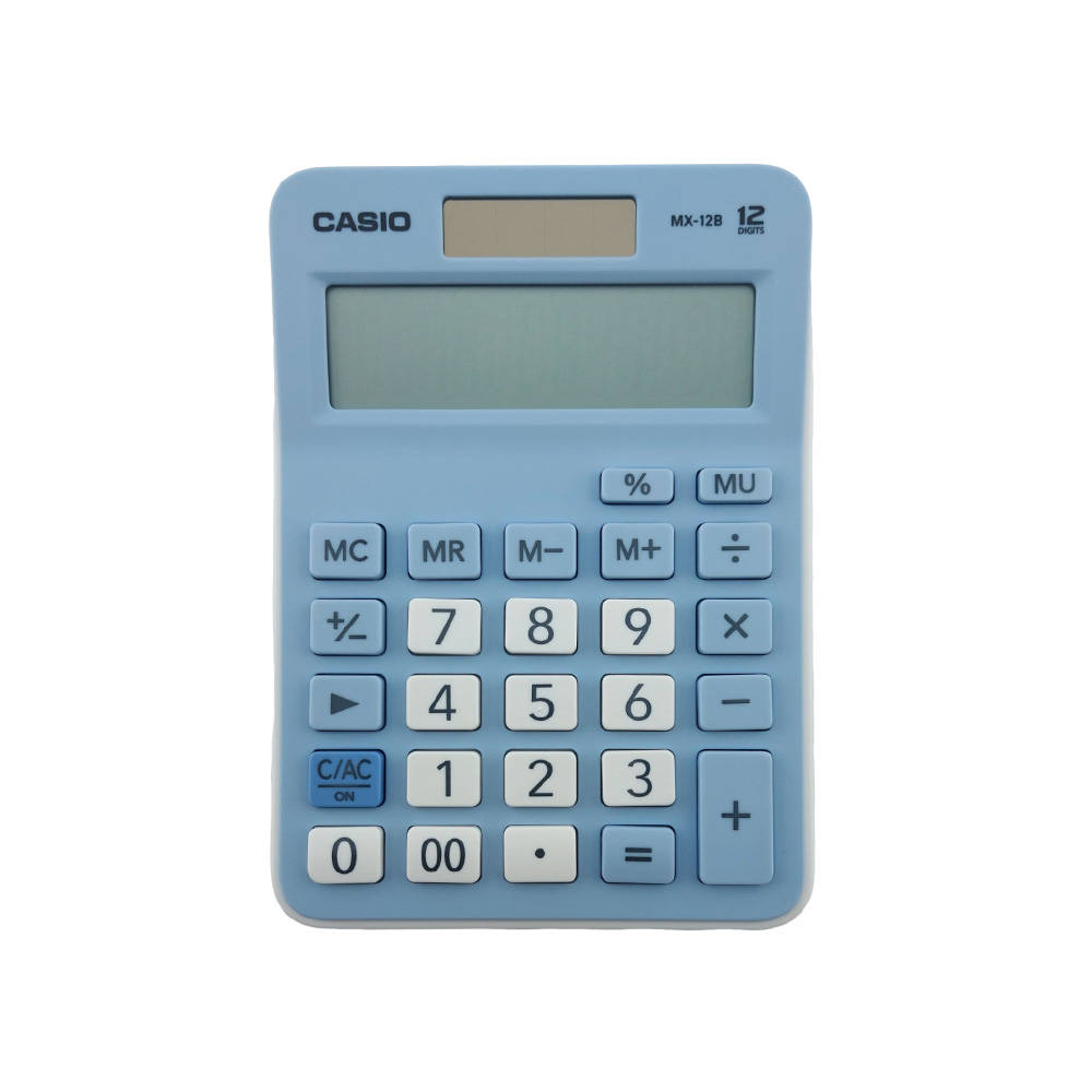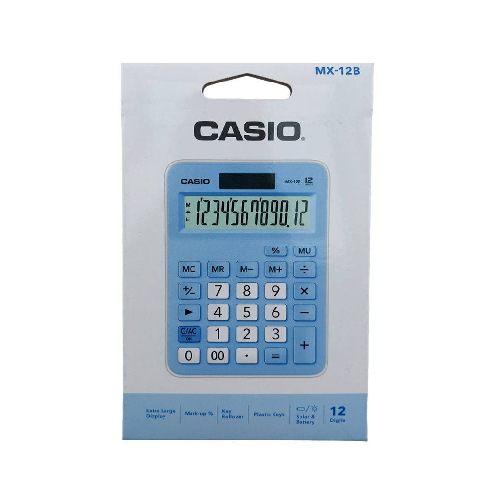 - La Calculadora MX-12B es un diseño tipo de mini-escritorio o sobremesa de atractivo color celeste con blanco.