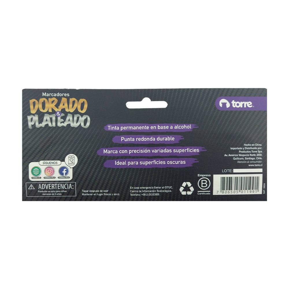 - Set de 2 marcadores tipo lápiz de colores metálicos (Dorado y plateado).