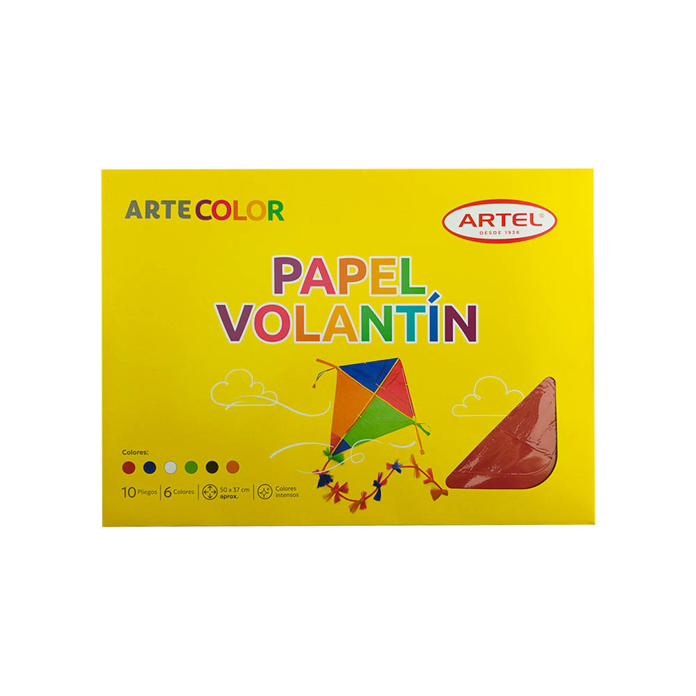 - El Bolsón con Papel Volantín de Artel tiene estructura cuadrada y está hecho de un delgado papel de colores.