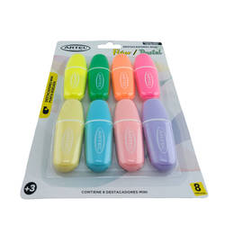 - Destacador en blister 04 unidades pastel (Amarillo / Verde / Naranjo / Rosado) / 04 unidades fluor (Amarillo / Celeste / Rosado / Lila).