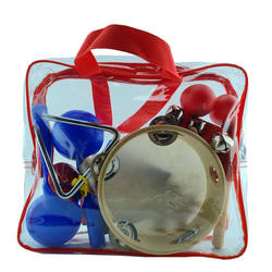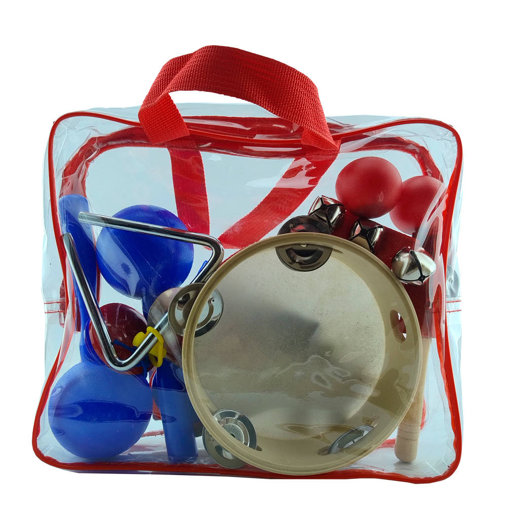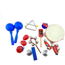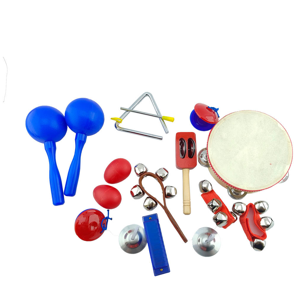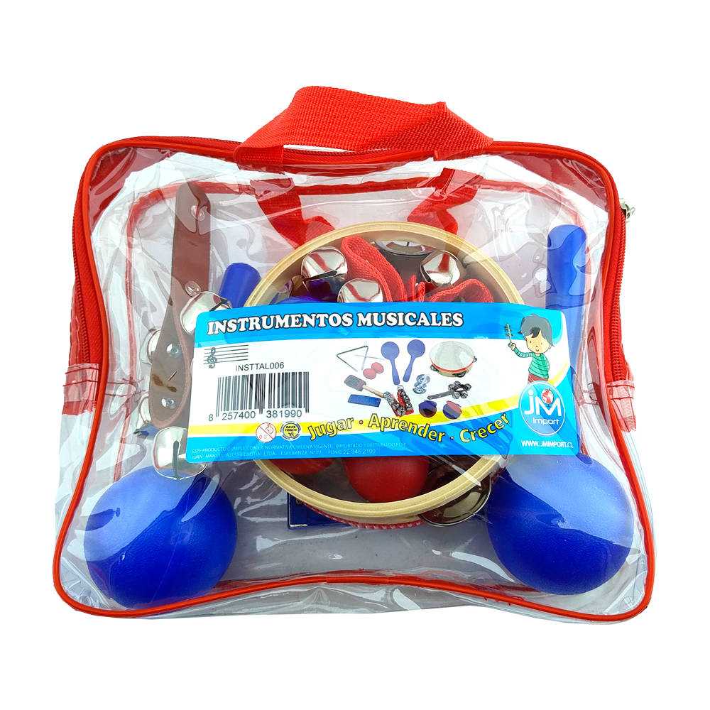 - Maleta de 10 instrumentos musicales de madera percusión compuesto por 1 pandero de madera con piel sintética, 2 huevos de percusión plasticos, 2 castañuelas de plástico, 2 pulseras de cascabel rojas de tela con 4 cascabeles cada una, 1 triángulo de metal, 1 sonajeros de 4 campanas, 1 sonajero de madera, 1 armonica, 2 maracas plasticas y 2 platillos dedo.