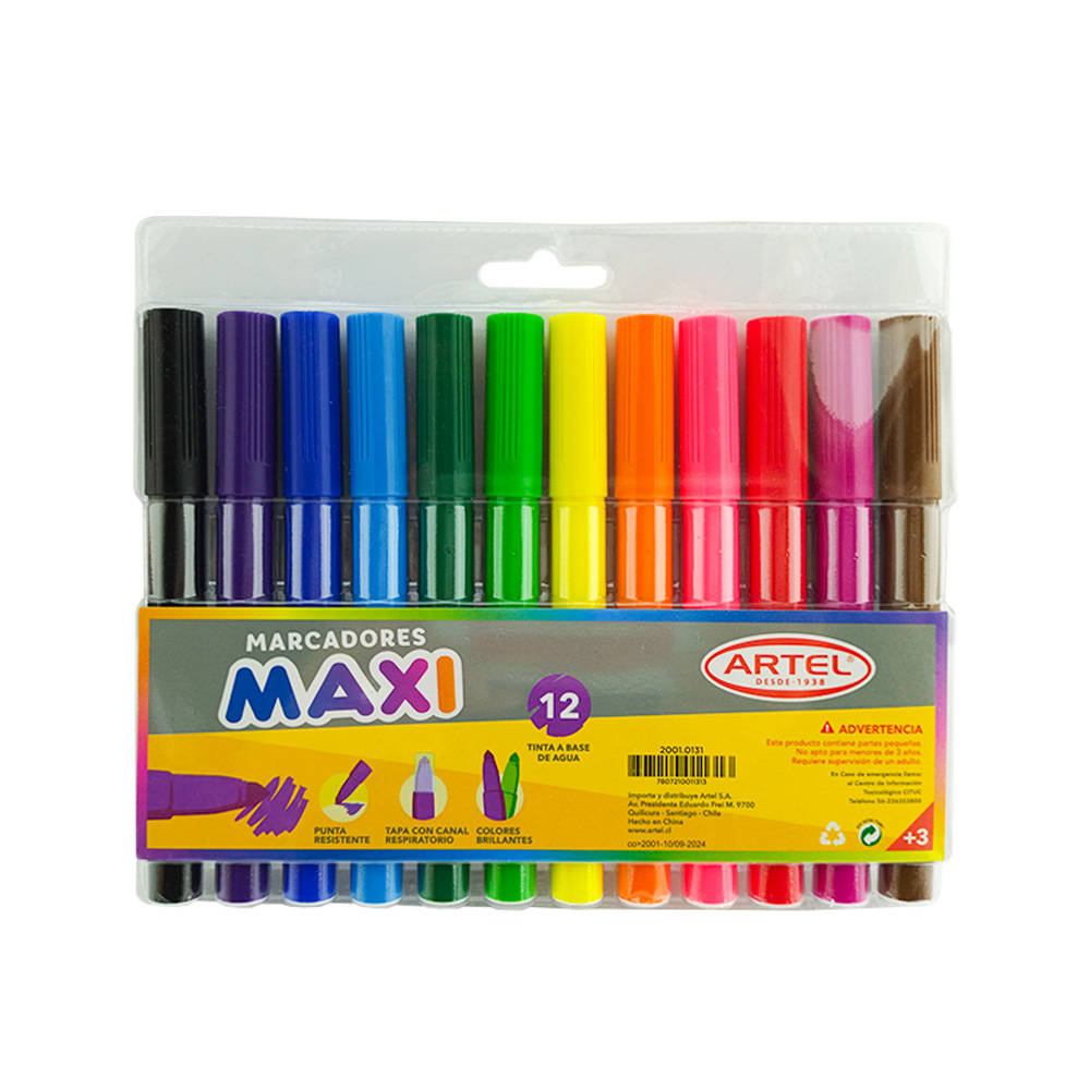 - Marcador Jumbo Escolar en estuche de 12 colores, con tinta a base de agua, apto para pintar en casi todos los tipos de papeles.