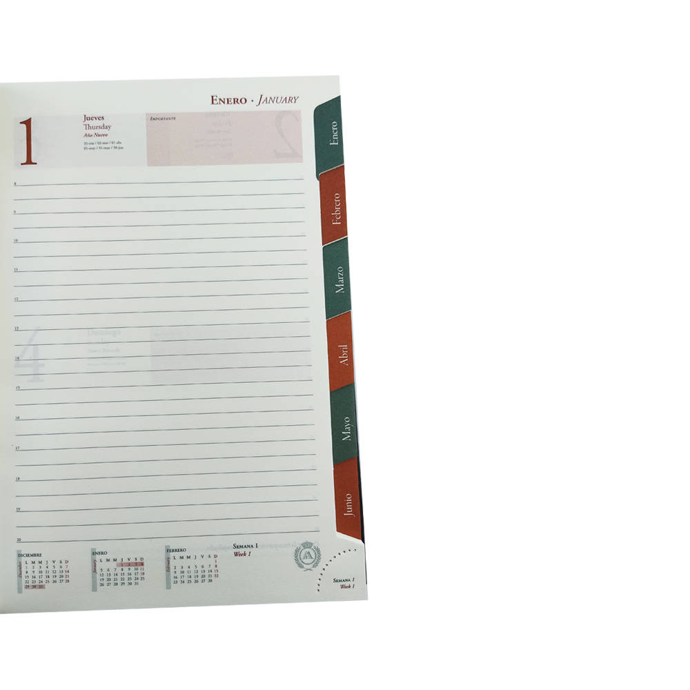 - Con marcadores mensuales al costado de la agenda que permiten un fácil acceso a las fechas de interés.